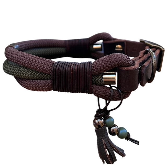 Dieses stilvolle, handgefertigte Hundehalsband kombiniert hochwertige Materialien mit einem einzigartigen Design. Die drei stabilen Paracord-Schnüre in warmem Braun und sattem Grün sorgen für eine edle Optik und hohe Widerstandsfähigkeit. Ergänzt wird das Design durch ein verstellbares Lederband und hochwertige Metallbeschläge. Der Leder Adapter ist 2cm dick.